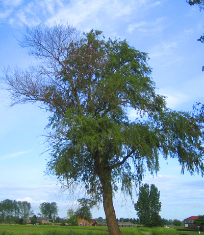 Wilg met watermerk ziekte deze ziekte word veroorzaakt door de bacterie Brenneria salicis deze verstopt de houtvaten waardoor verwelking en taksterfte optreed hierdoor word deze boom een risicoboom daar dit dodehout er uit zal waaien of breken watweer kan leiden tot schade bij derden. |