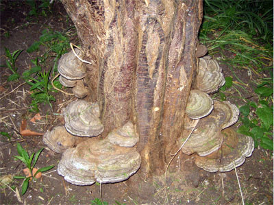![]() Zoals op de foto te zien heeft deze Prunus een zeer zware aantasting van de platte Tonderzwam op de stamvoet. Deze witrot veroorzakende zwam zal zeker de dood van de boom betekenen wat weer een groot risico op windworp geeft met alle schade die dat weer kan veroorzaken. ![]() |